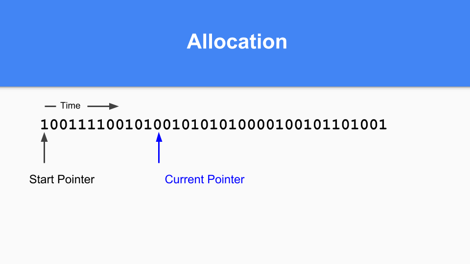 So how is this going to work in a non-moving situation? Here is the mark / allocation map. Basically you maintain a current pointer. When you are allocating you look for the next zero and when you find that zero you allocate an object in that space.
