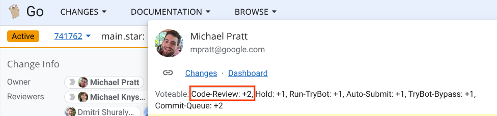 To check if a CL owner is an approver (and thus able to submit their own CLs), hover over their name chip. If the “Voteable” section shows “Code-Review+2”, then they are an approver.