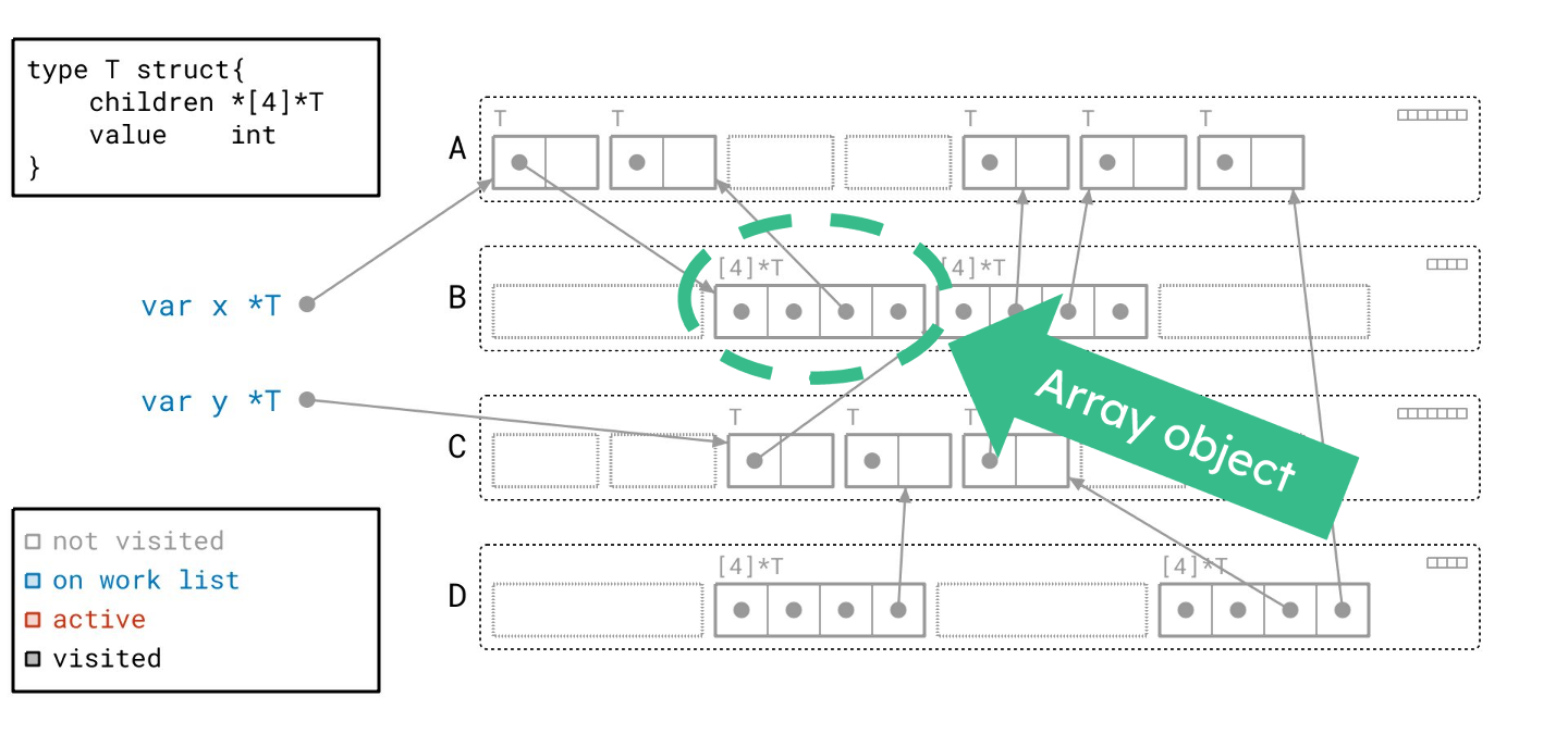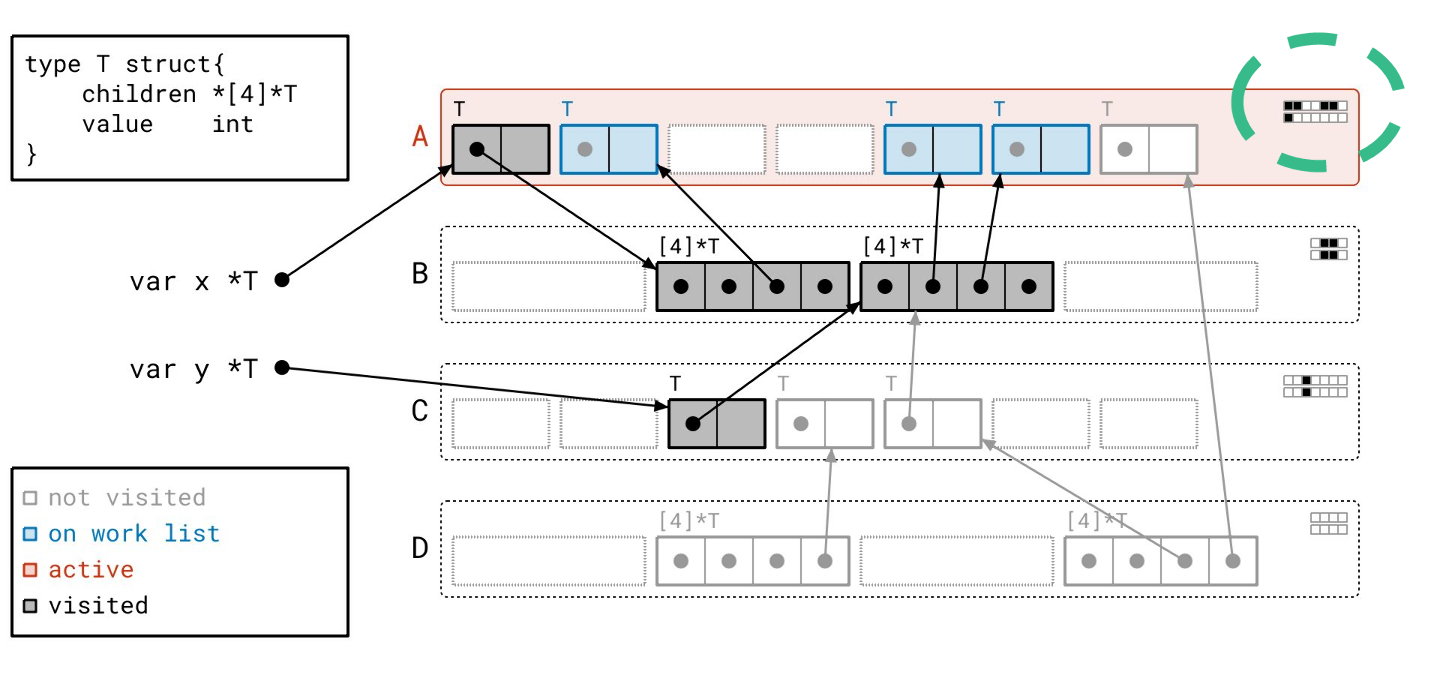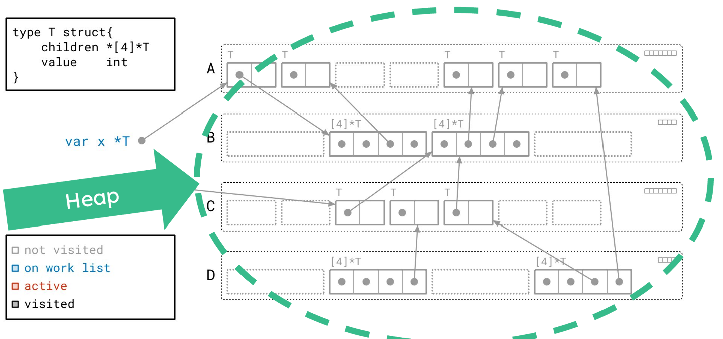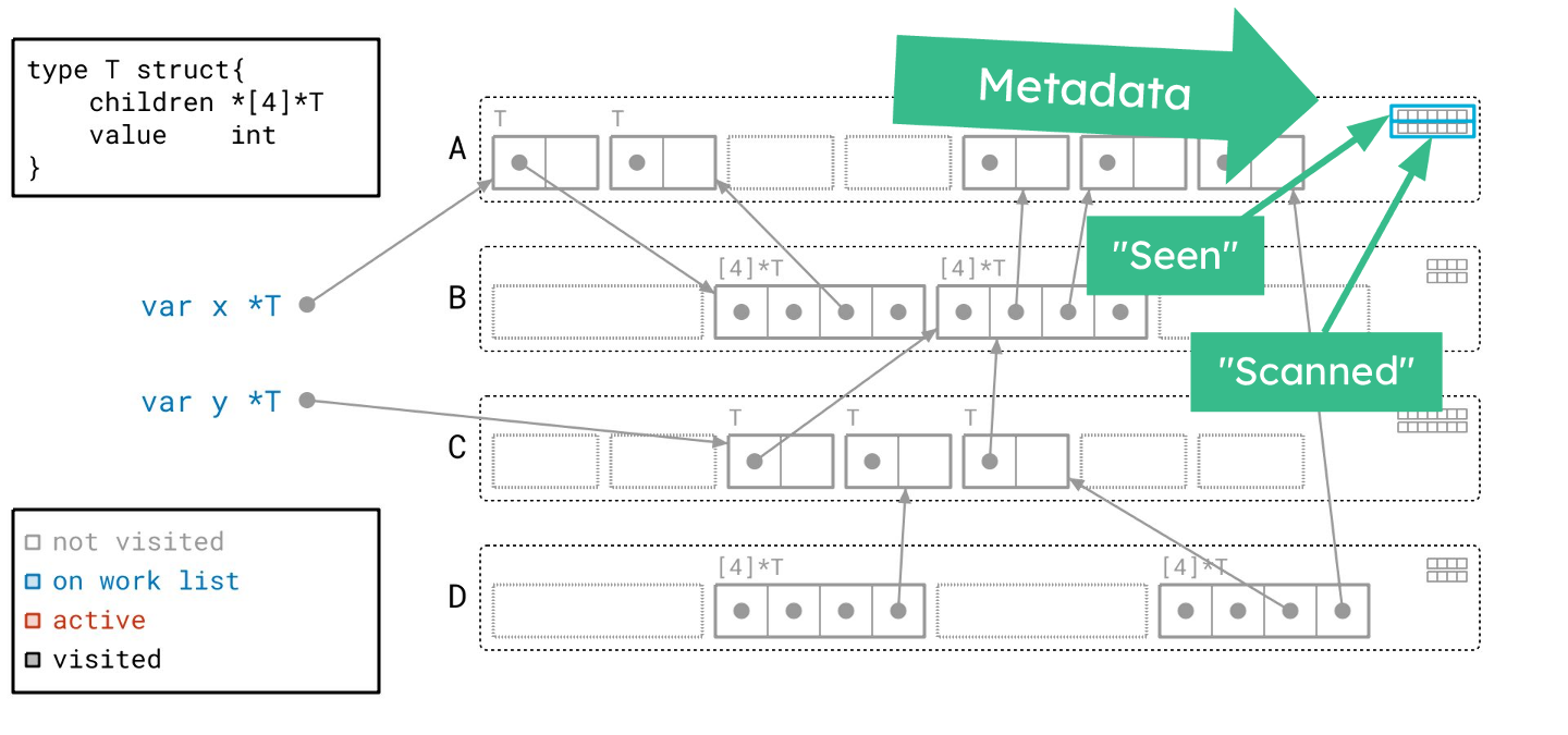 Let’s see what this means in practice by looking at our example heap again, but this time running Green Tea instead of the straightforward graph flood.