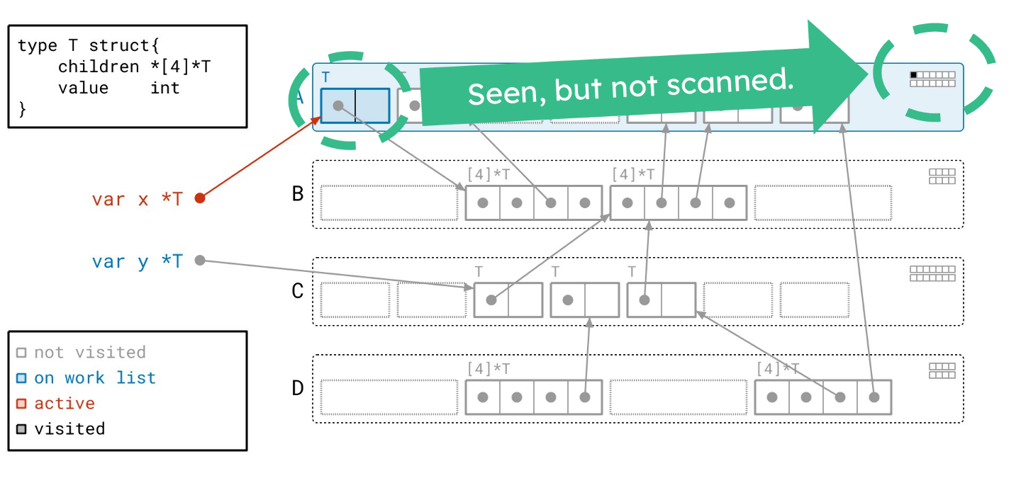 Let’s make that more concrete by looking at our example again. I’ve overlaid the heap here with the path that we took. Each left-to-right arrow represents a piece of scanning work that we did and the dashed arrows show how we jumped around between bits of scanning work.